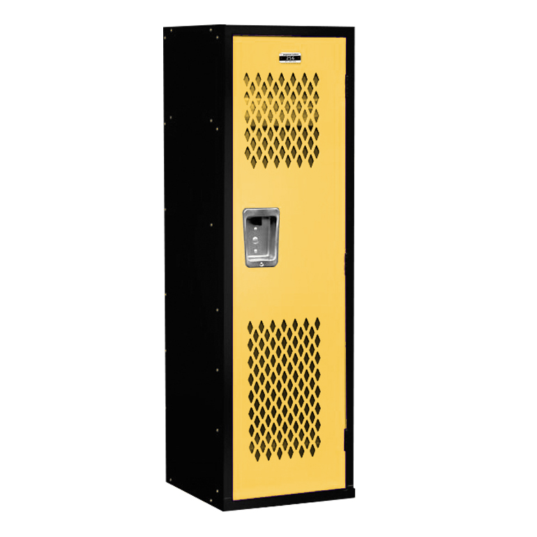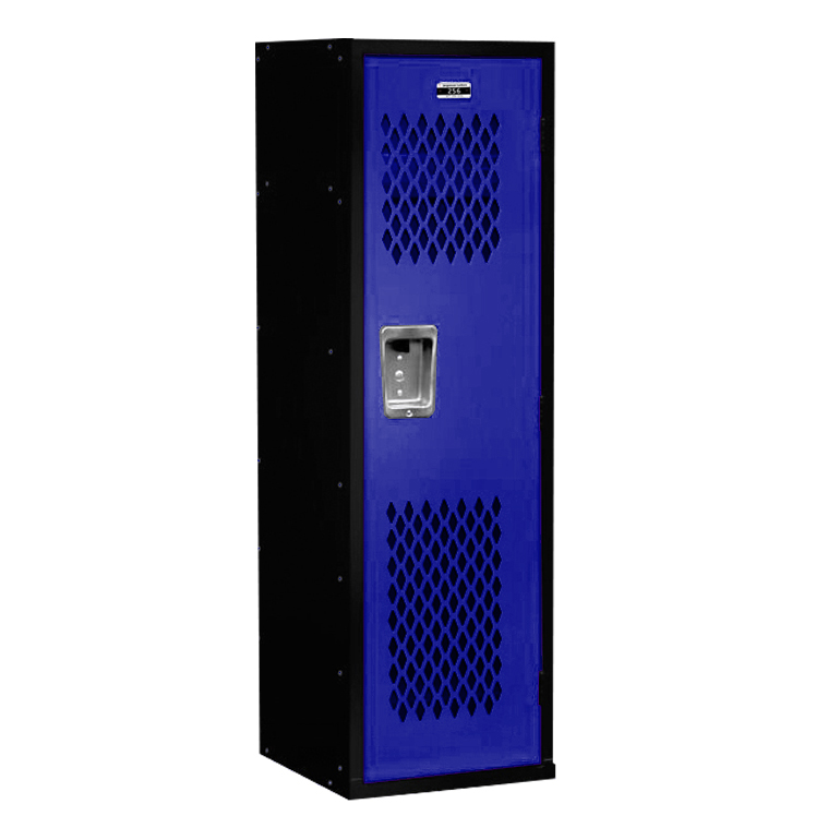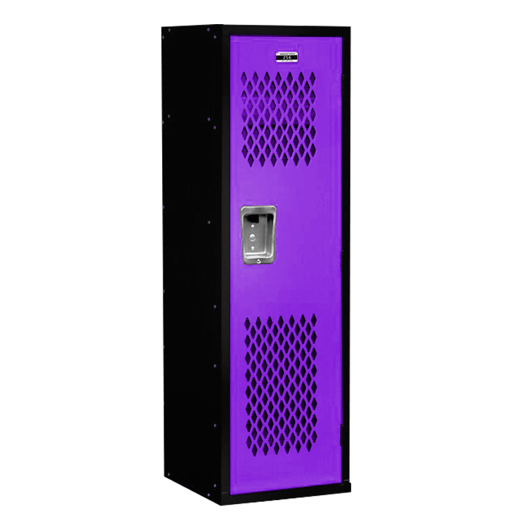 These fun, durable lockers are designed with kids in mind and are perfect for organizing kids’ rooms, garages, sports themed bedrooms, game rooms, mud rooms, and school rooms. The perforated door design gives them the look of athletic or team room lockers which will make the perfect sports themed storage area for your child. They are the perfect size for kids of all ages in a large 15″ wide x 15″ deep size to discourage tipping and 48″ high overall. These are manufactured to the same durable specifications as our premier line with heavy 16-gauge lockable metal doors and frames. The interior includes hooks for clothing or coats and an upper shelf for convenient storage and access of kids sports memorabilia, kids trophies, games, books, hats and any other personal valuables.