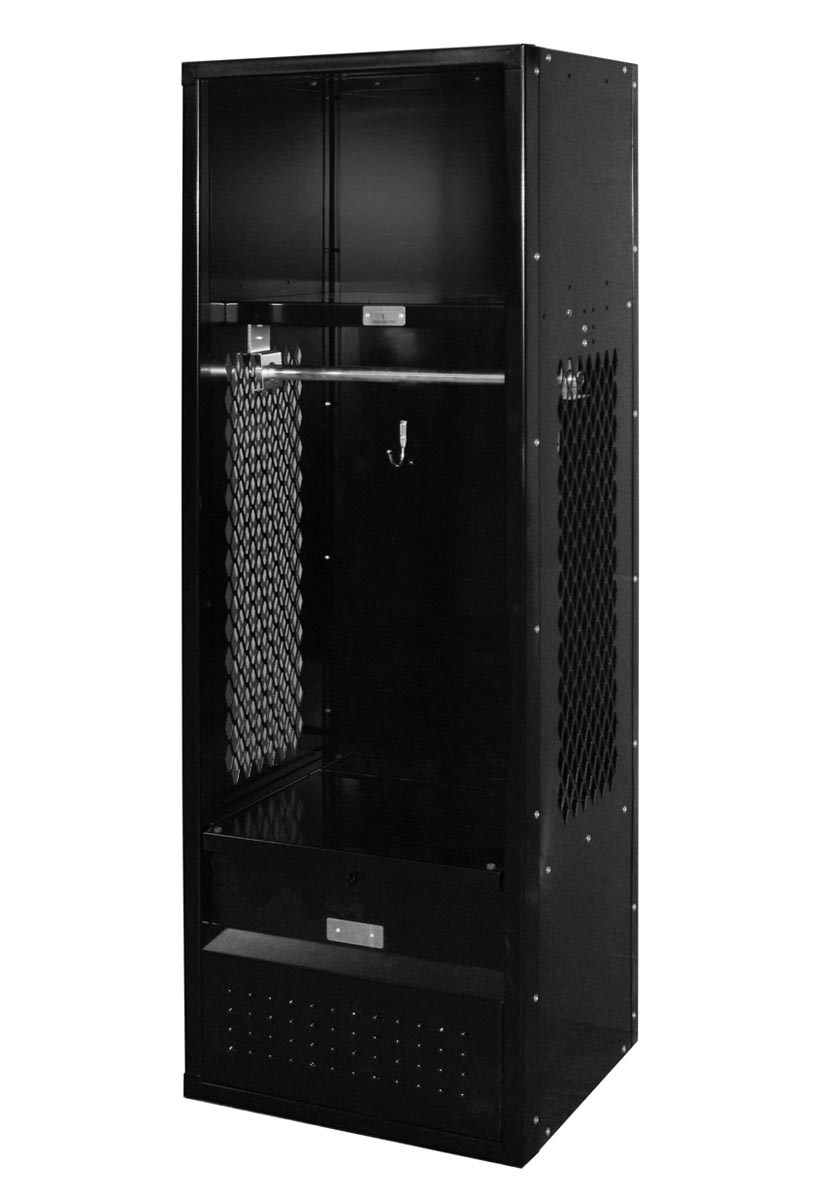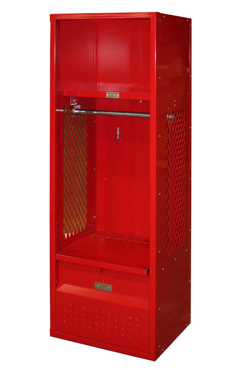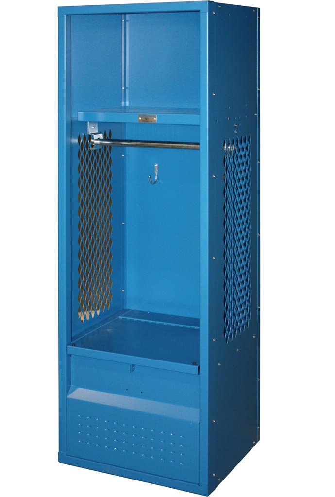 These are 18″ wide x 15″ deep x 54″ high and include a full width shelf, coat rod, coat hooks and a lockable footlocker with a hinged, reinforced seat at the base.