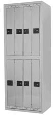 These big garment locker units have 8 compartments with individual doors and 1 large door for access to all 8 compartments. They accommodate hanger-held uniforms or garments for eight people.