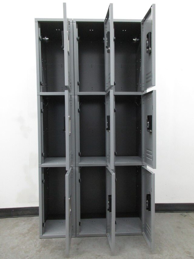 These are brand new 3-tier lockers that received some scratches and scuffs due to shipping and have been discounted for quick sale. Each column is 72″ high and contains 3 lockers that are 12″ wide x 15″ deep x 24″ high. They are ready for several types of locks including padlocks, combination locks, key locks and electronic locks which we also sell. They ship pre-assembled to your school, office or home saving you time and money.