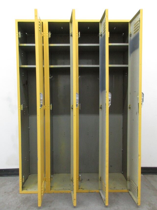 These 1-tier lockers are fully functional and in good working order. Each is 12” wide x 15” deep x 72” and contains two upper shelves for additional storage options. These lockers require the use of a built-in key or combination lock in order for the doors to remain closed and locked which are not included, but available for purchase. Most are preassembled in groups of 4 columns wide, however we do have a few 3 wide and 5 wide groups available as well. Single tier lockers are perfect for students to use at school to store their books, coats, phones and personal items in while at class. They are also commonly used as employee lockers at work and even customer lockers at your place of business. Call today and talk to one of our sales associates about these or any other locker needs you may have.