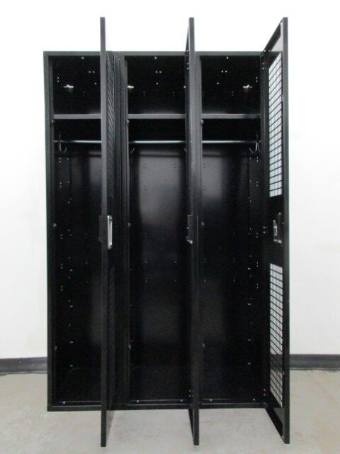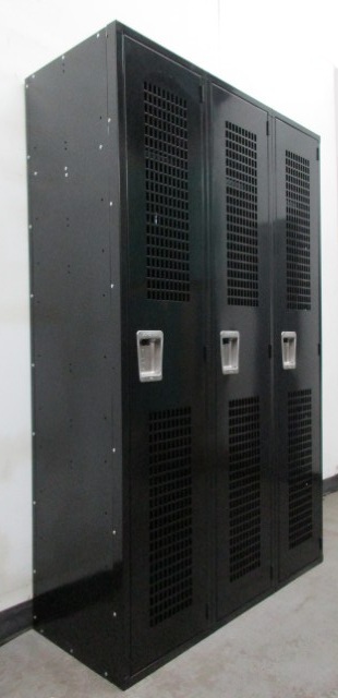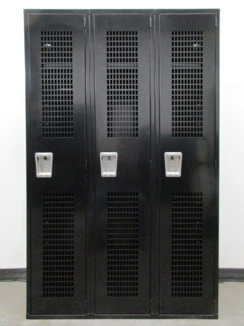These used single tier ventilated metal lockers are quite large and capable of storing a lot of items. Each locker is 15″ wide x 18″ deep x 72″ tall. The neutral black color will go nicely in most any room. They are commonly used as gym or locker room lockers but could also be used as storage lockers in your home, office or anyplace you need store securely store and organize valuable items. Call today for more information regarding these or any of our other new and used lockers.