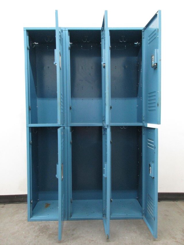 These used 2-Tier student lockers have some minor surface rust but otherwise are in good condition and completely functional. Even with the rust, these lockers will still last many more years. They are quite large measuring 15″ wide x 15″ deep x 72″ high overall and are padlock ready. Besides being used in schools for students, they are also commonly used at work in warehouses, breakrooms for employees, or common areas for customers and patrons to use while visiting your business.