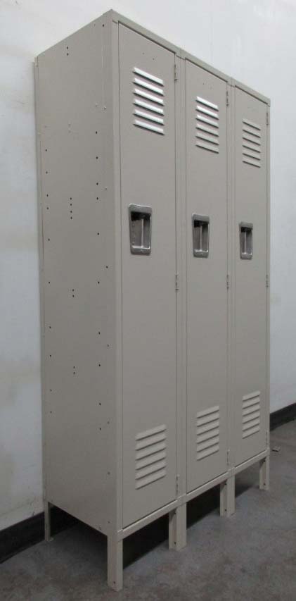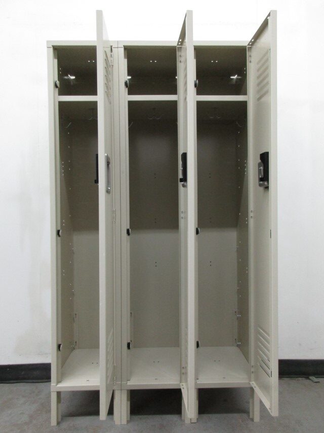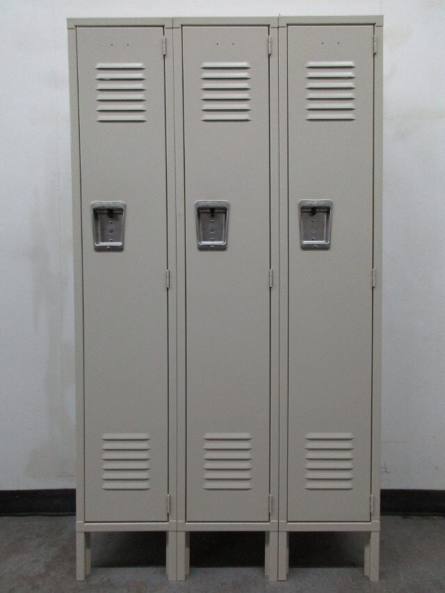 These single tier lockers are in very good condition and 100% functional. They measure 12″ wide x 15″ deep x 60″ high and can be secured with a common padlock. The neutral tan color will compliment any room or office. A cool way to safely store and organize most anything that will fit in them.