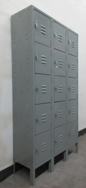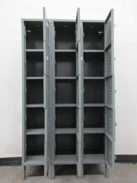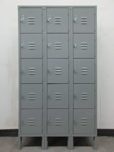 We have these used 5-tier box lockers for sale that are perfect for the storage of smaller items. Each compartment is 12″ wide x 15″ deep x 12″ high. There are 5 compartment in each column that is 66″ over all including the 6″ legs. These are great for small items and work well in lunch rooms, break rooms, offices, etc. Each locker can be locked with a simple padlock. Built-in style key or combination locks could also be added to these lockers.