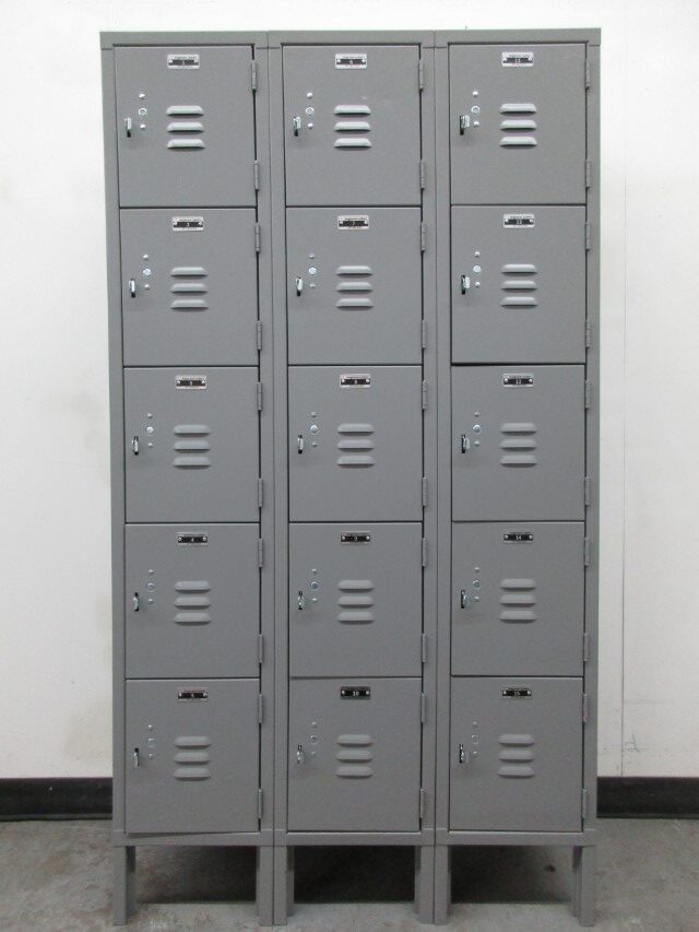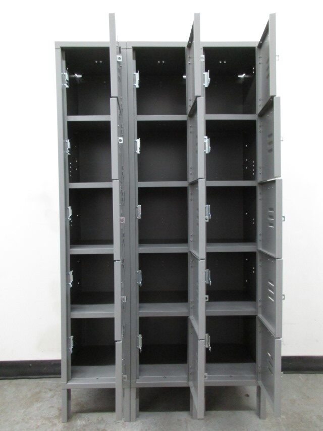 We have these used 5-tier box lockers for sale that are perfect for the storage of smaller items. Each compartment is 12″ wide x 15″ deep x 12″ high. There are 5 compartment in each column that is 66″ over all including the 6″ legs. These are great for small items and work well in lunch rooms, break rooms, offices, etc. Each locker can be locked with a simple padlock. Built-in style key or combination locks could also be added to these lockers.