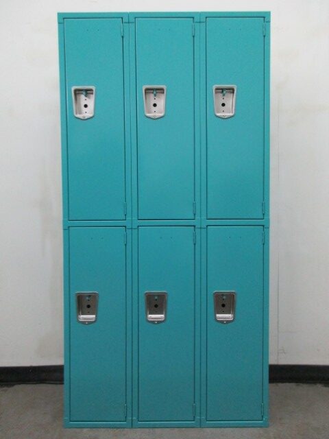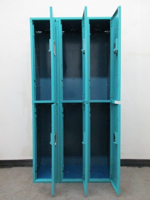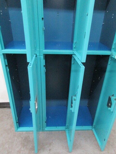 These used 2-tier steel lockers are 12″ wide x 15″ deep x 72″ high and in very good, fully functioning condition. They are constructed of teal door and frames with blue bodies. They are typically used in schools as student lockers or break rooms as employee lockers, but can be used by anyone anytime where secure storage is needed . Each locker comes equipped with clothing hooks and a padlock hasp. Call today for pricing and shipping options.