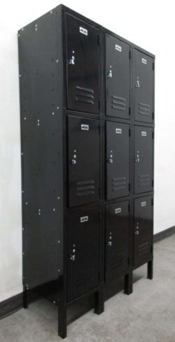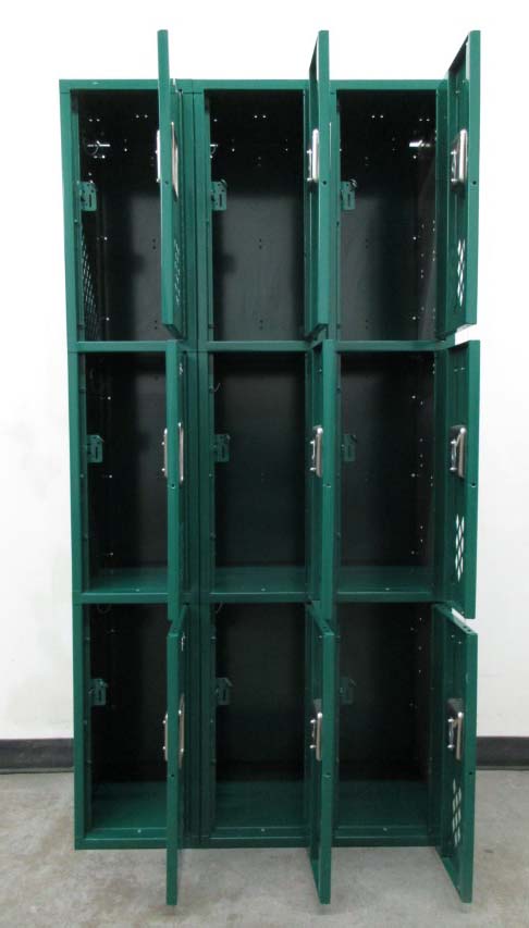 These 3 tier lockers are perfect for a wide range of storage applications and are most commonly used in locker rooms, schools and gyms. These gym lockers feature heavy duty construction and ventilation on both doors and side panels. The diamond perforations encourage daily air flow, making them suitable for high humidity settings. Each locker column features three compartments that are equipped with steel hooks inside. The green finish is still in great shape with very minor signs of wear and functionality is comparable to new lockers without the retail cost. Doors include recessed, stainless steel handles and can be secured using padlocks or combination lock types.