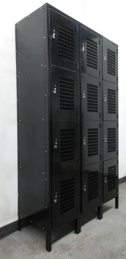 We have 6 columns (24 locker compartments) of these 4-tier lockers that have visually perforated doors that allow for visual inspection and added air circulation to help reduce smell. These are perfect student or employee lockers. They are just the right size measuring 15″ wide x 18″ deep x 72″ tall for most situations. Contact us today for more information about these or any of our other lockers.