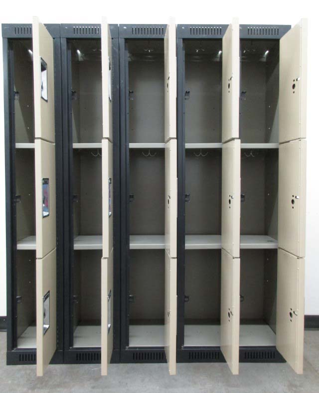 These fabulous three-tier lockers are in good overall condition. Each compartment is 12″ wide x 15″ deep x 24″ high and has ventialted doors and number plates. The doors can be locked with a removable padlock or a built-in key or combination lock to keep the locker contents safe and secure. Lockers such as these are commonly used in schools, gyms, employee break rooms, or even homes to store clothing, toys, crafts, etc.