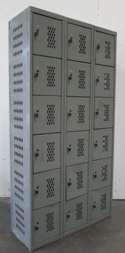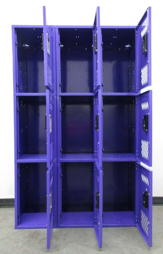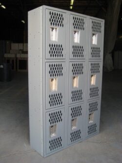 Heavy Duty 3-Tier Lockers are perfect for gyms and locker rooms. Each column contains three compartments that are 15″ wide x 18″ deep x 24″ high. Many middle and high schools use these type of lockers for their PE classes. They are tremendously strong and the perforations in the doors help to control odors in the locker room. Use a padlock or a built-in combination lock to keep locker contents safe and secure while being used.