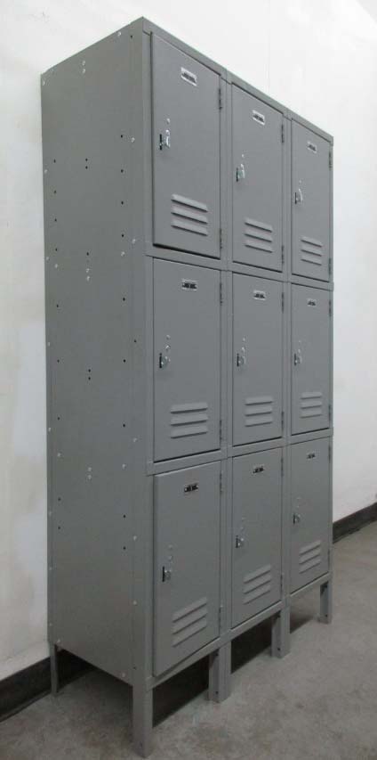 Purchase these used 3-tier lockers today for you school, home or business. They are are ideal for secure storage of smaller items. Each locker compartment is 12″ wide x 15″ deep x 24″ high and padlock ready. the columns are 78″ high including the 6″ legs. They are a neutral gray color and will compliment any room. They have a few dings and minor cosmetic blemishes but are other wise like new.