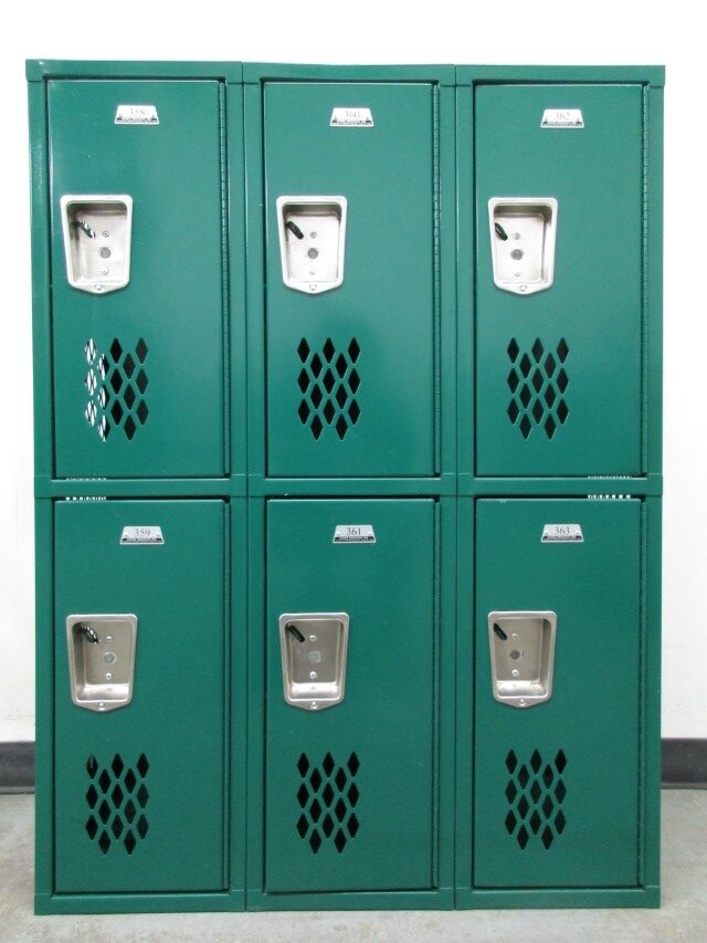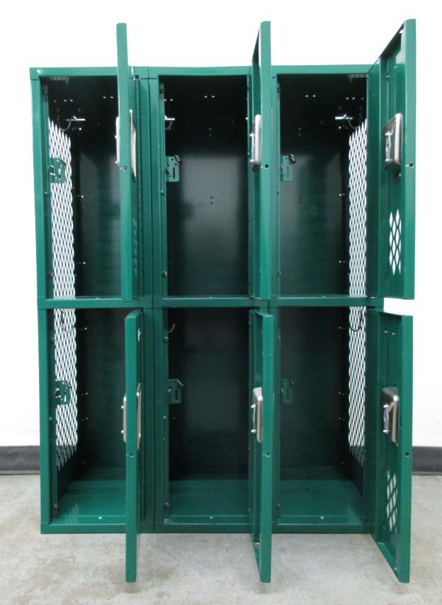 These short 2-Tier ventilated lockers are ideal for athletes as they help keep locker contents secure but they also reduces the amount of odor by helping the locker contents stay dry because of the extra air flow the holes in sides and doors promote. Each compartments is 12″ wide x 15″ deep x 24″ high in cloums that are 48.5″ high and fully functional. They can be locked with a common padlock or even a built-in style key or combination lock. These lockers are often used in locker rooms, garages, gyms, etc.