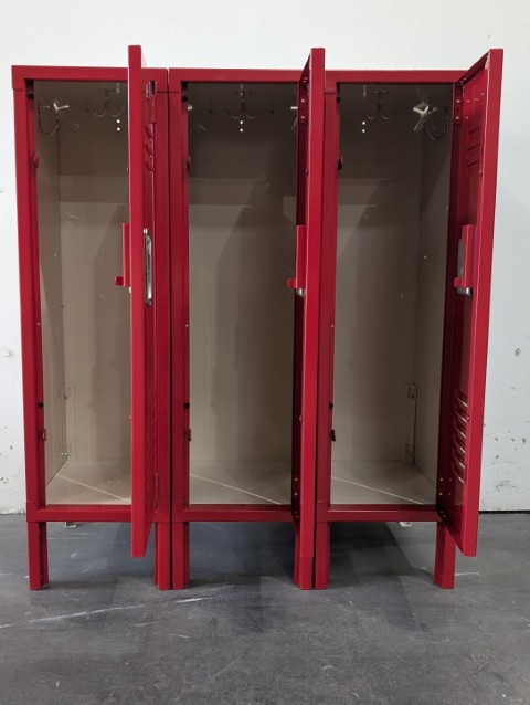 For sale: slightly used single-tier lockers measuring 12″ wide x 15″ deep x 36″ high, plus sturdy 6″ legs for added elevation and easier floor cleaning. These lockers feature convenient interior hooks for hanging belongings and are padlock-ready, offering secure personal storage. With vibrant red doors and classic beige bodies, they provide a bold yet professional look perfect for gyms, schools, workshops, or employee break rooms. Durable and space-efficient, these lockers combine function and style at a great value. Ideal for anyone seeking affordable, reliable storage solutions with a splash of color.