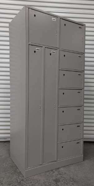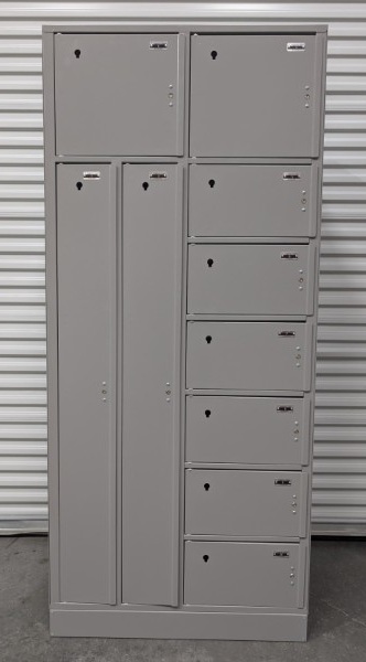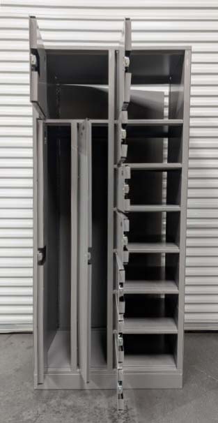 Used  pass through evidence locker in good condition, perfect for police departments, security offices, schools, or businesses that need secure storage. Features multiple locking compartments in various sizes, ideal for organizing evidence, valuables, documents, or personal items. Sturdy metal construction with a durable neutral finish. All doors close securely and show normal wear from use. Clean, solid, and ready for service.